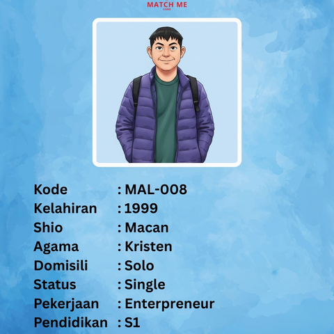Match Me Card merupakan Data Singles yang telah mendaftar kepada kami. Peserta yang mendaftar akan didata dan dibuatkan Kartu Avatar yang akan kami publish di website ini.