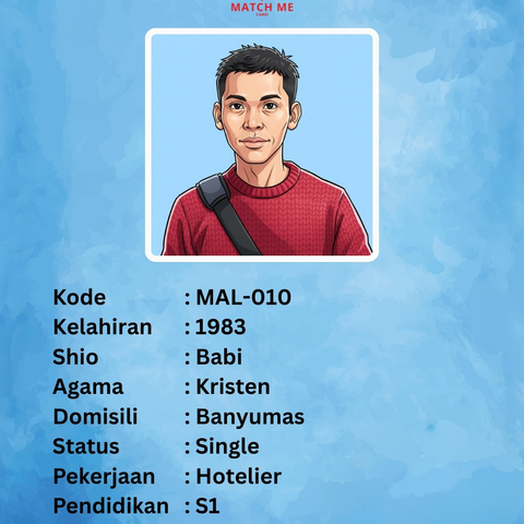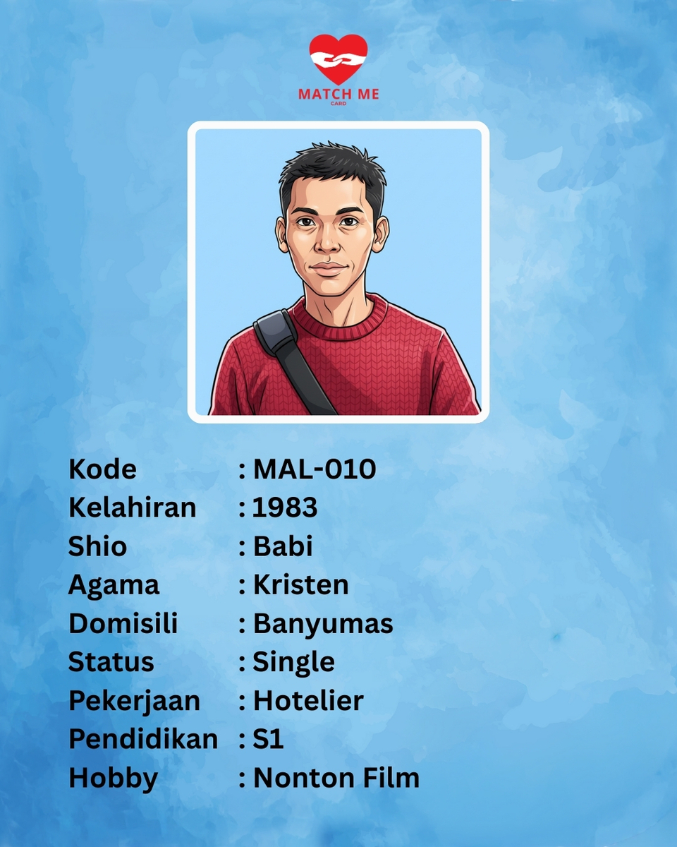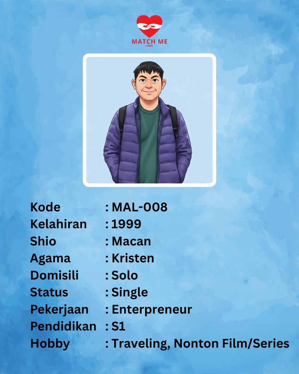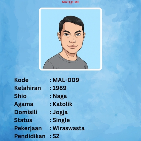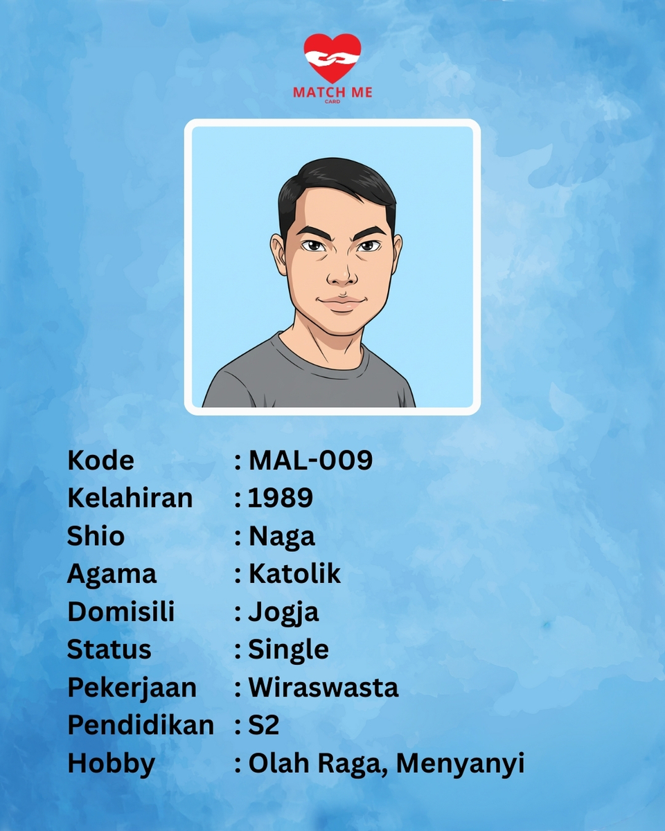 Match Me Card merupakan Data Singles yang telah mendaftar kepada kami. Peserta yang mendaftar akan didata dan dibuatkan Kartu Avatar yang akan kami publish di website ini.